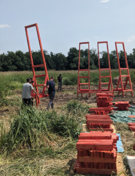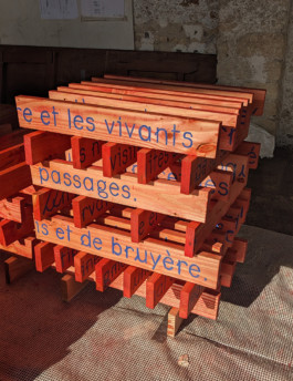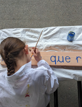 Les ateliers menés avec le lycée Ste Jeanne d’Arc ont accompagné la mise en place de la micro-architecture dans la Prairie du Roy. Les élèves ont participé au travail de fondation en zone inondable ainsi qu’aux premières étapes de construction en bois. Leurs interventions ont pris place au moment où la structure commençait à se dresser dans le paysage, en lien direct avec les contraintes et la matérialité du site. L’atelier mené avec l’école primaire de Beaulieu-lès-Loches s’est inscrit dans une autre phase du projet : la réalisation des peintures en lettres. Les enfants ont pris part à la mise en forme graphique de la citation inscrite sur les assises, donnant une présence visuelle aux mots qui accompagnent l’installation.