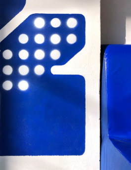 La signalétique est protéiforme et faite au maximum en atelier collectif avec les matériaux à disposition: panneaux de bois, plotter de découpe et papier adhésif, peintures, pochoirs à la bombe. Elle est complété par un jeu de plaques perforées et thermolaquées pour une partie de la signalétique pérenne du lieu. Le fil conducteur est le bleu du Sample qui unifie les différents type de signalétiques, décorations et aménagements.